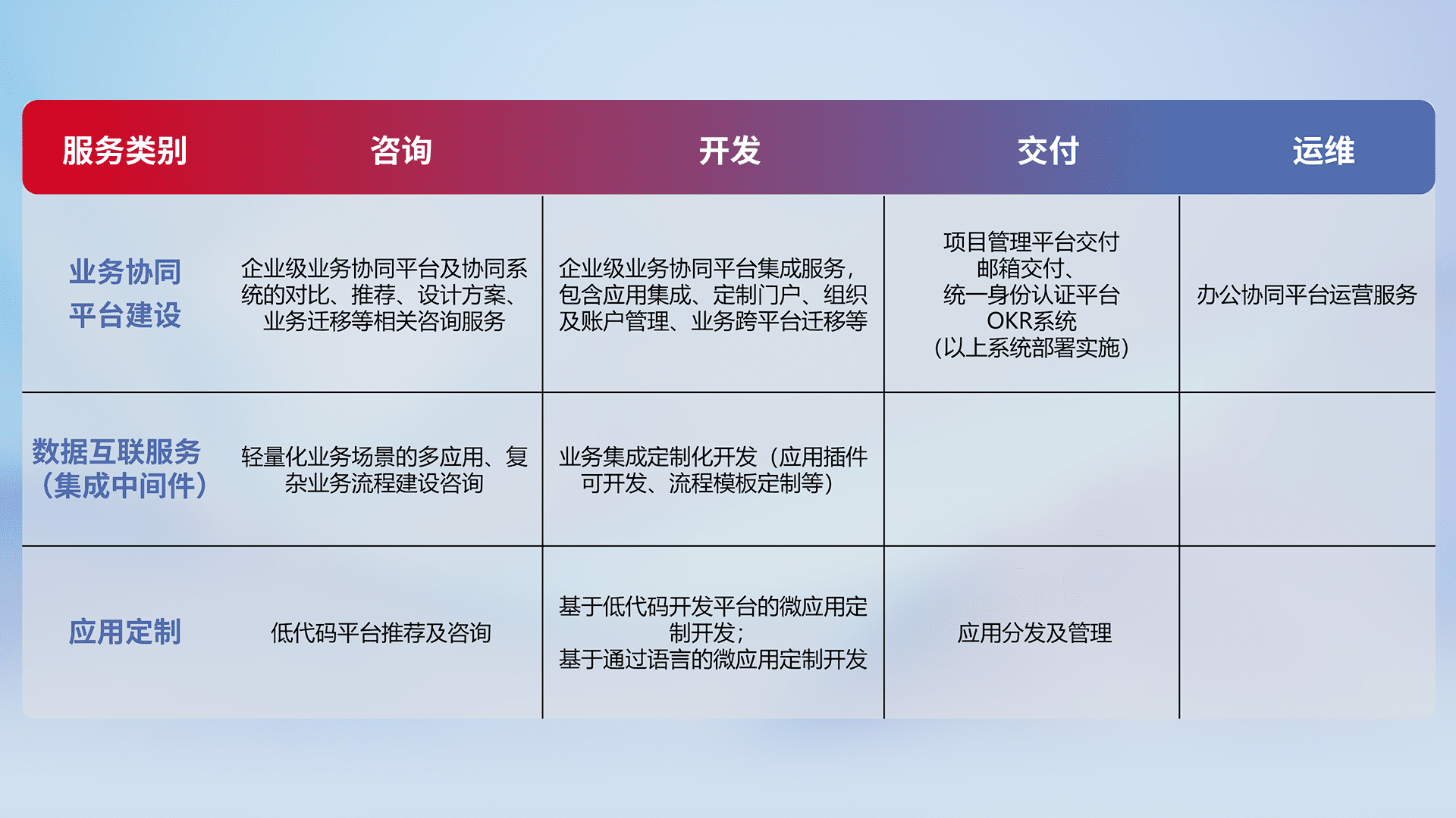 针对钉钉、、、、企微、、IDaas等平台级产品提供产品的规划、、方案、、交付、、定制化开发等服务,,实现如统一协同办公、、智能客户服务、、、混合会议管理、、、智能数据查询、、等业务场景,,实现数字化转型。。