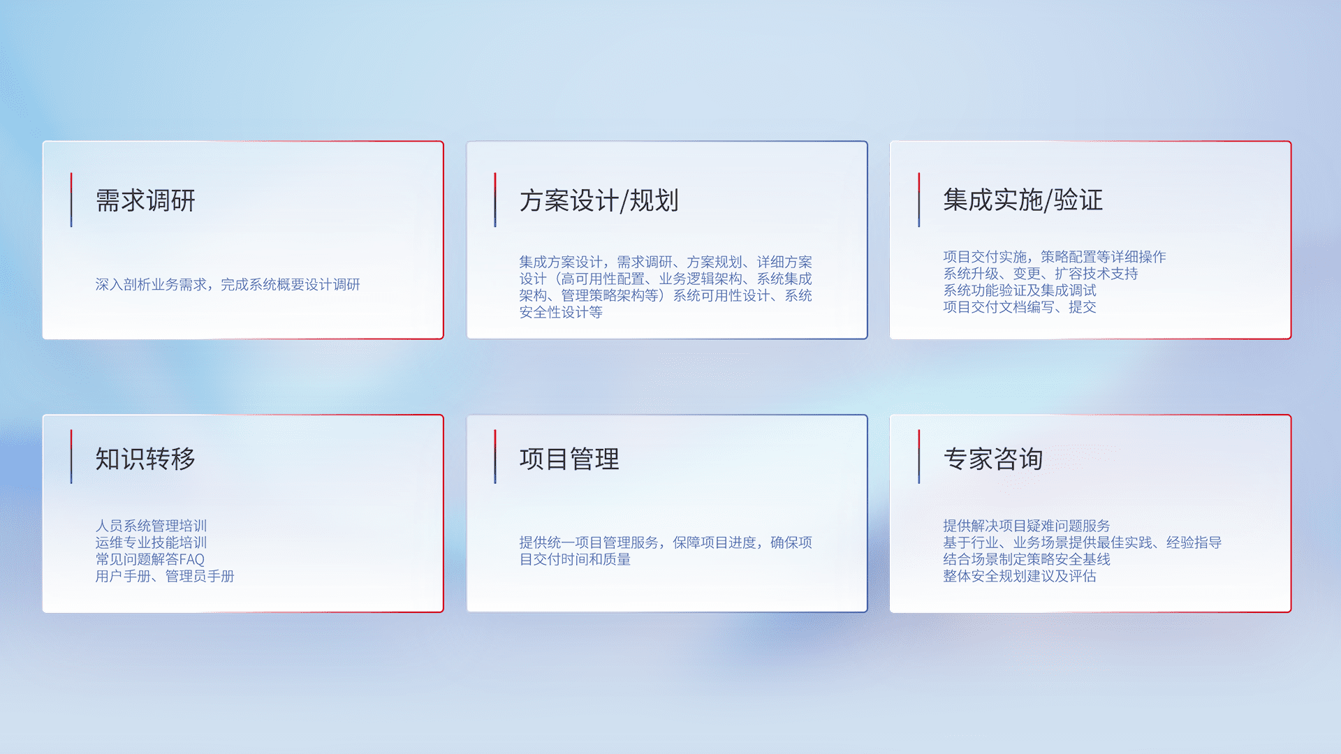 针对客户行业特性,,,将宏观的安全战略和需求,,通过专业的交付服务,,,实现项目落地,,为客户提供标准规范的集成交付服务。。。